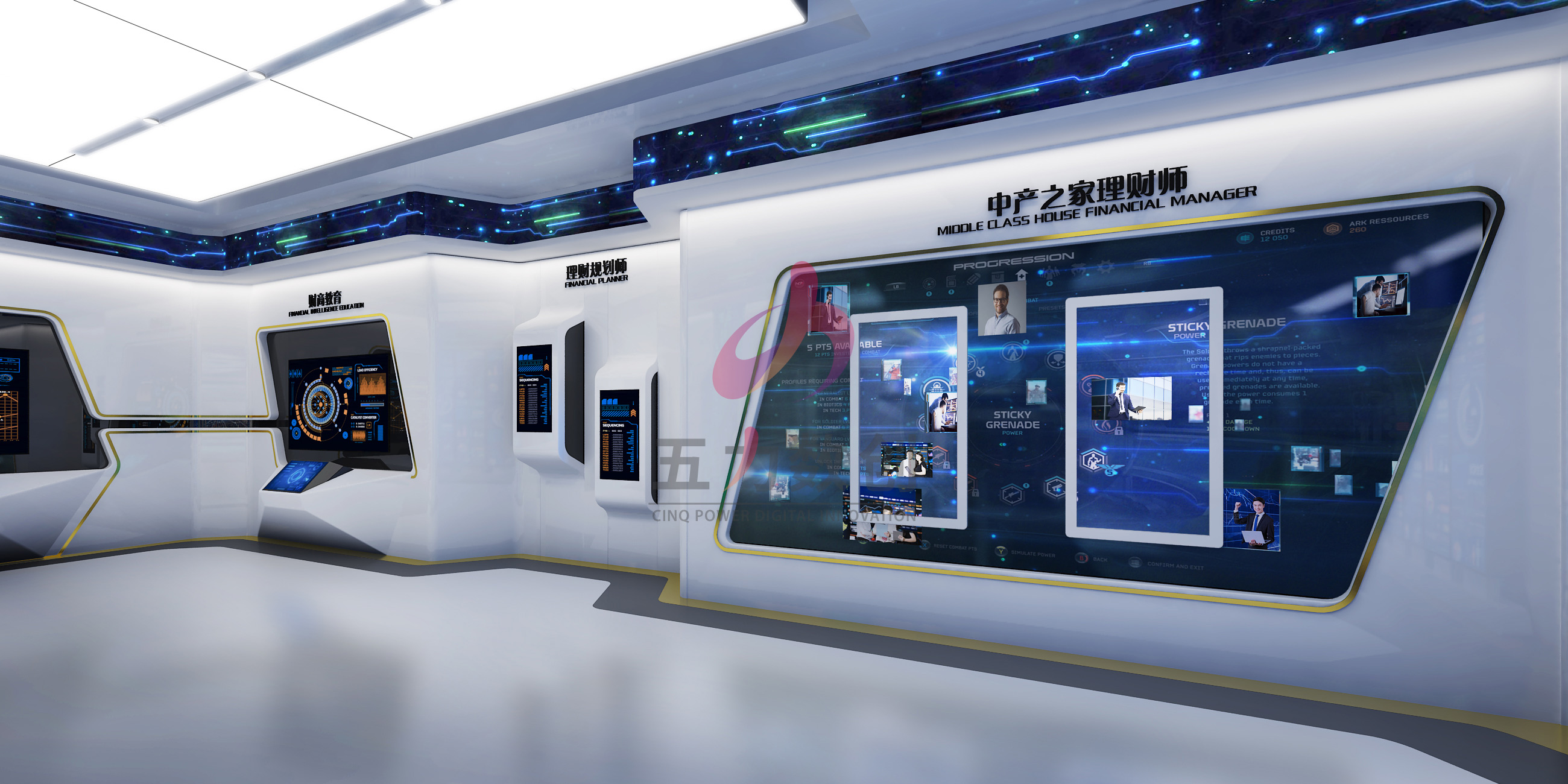 五力數創根據中產之家需求,為中產之家智能服務體驗中心打造富有科技感的數據展示空間,營造沉浸式體感互動的主題空間,綜合展示企業綜合實力。